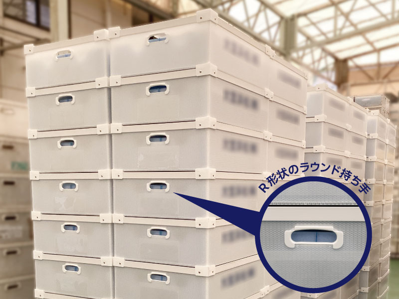 BYボックスは持ち手が大きく手になじむR形状の設計となっているため、箱が持ちやすくなり、作業時に手へかかる負荷が軽減された。繰り返し行う詰め作業やパレタイズ工程においても気にならなくなり、作業環境の改善につながった。